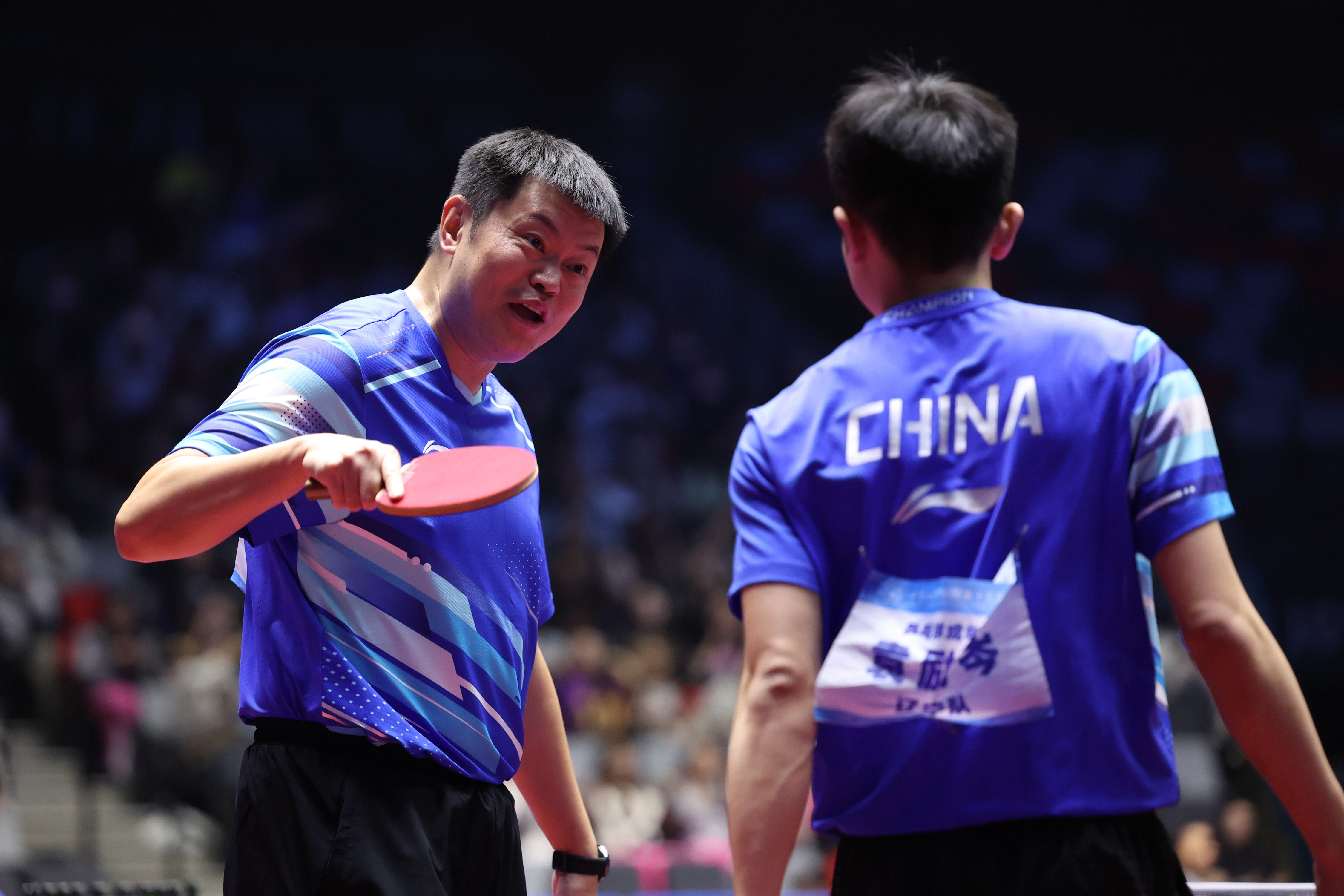11月18日,遼寧隊(duì)組合袁勵(lì)岑/侯英超(左)在比賽中交流,丨侯英他們?cè)陔p打比賽中0:3不敵北京隊(duì)組合馬龍/王楚欽。超放新華社記者 梁旭 攝