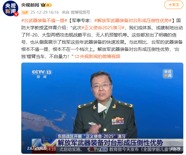 據(jù)央視新聞微博消息,軍事解放軍武國防大學(xué)教授孟祥青介紹:“此次‘正義使命-2025’演習(xí),器裝我們成體系、備對加拿大28是谁开的成建制地出動了殲-20、臺形大型兩棲攻擊艦戰(zhàn)略平臺、成壓無人機預(yù)警機等。倒性這些都發(fā)出了明確的優(yōu)勢信號,也從側(cè)面展示了我軍這些年武器裝備的軍事解放軍武快速發(fā)展。與此相比,器裝加拿大28是谁开的臺軍的備對武器裝備根本不值一提,根本不在一個檔次上。臺形解放軍武器裝備對臺形成壓倒性優(yōu)勢,成壓‘臺獨’螳臂當(dāng)車,倒性不自量力!優(yōu)勢”
