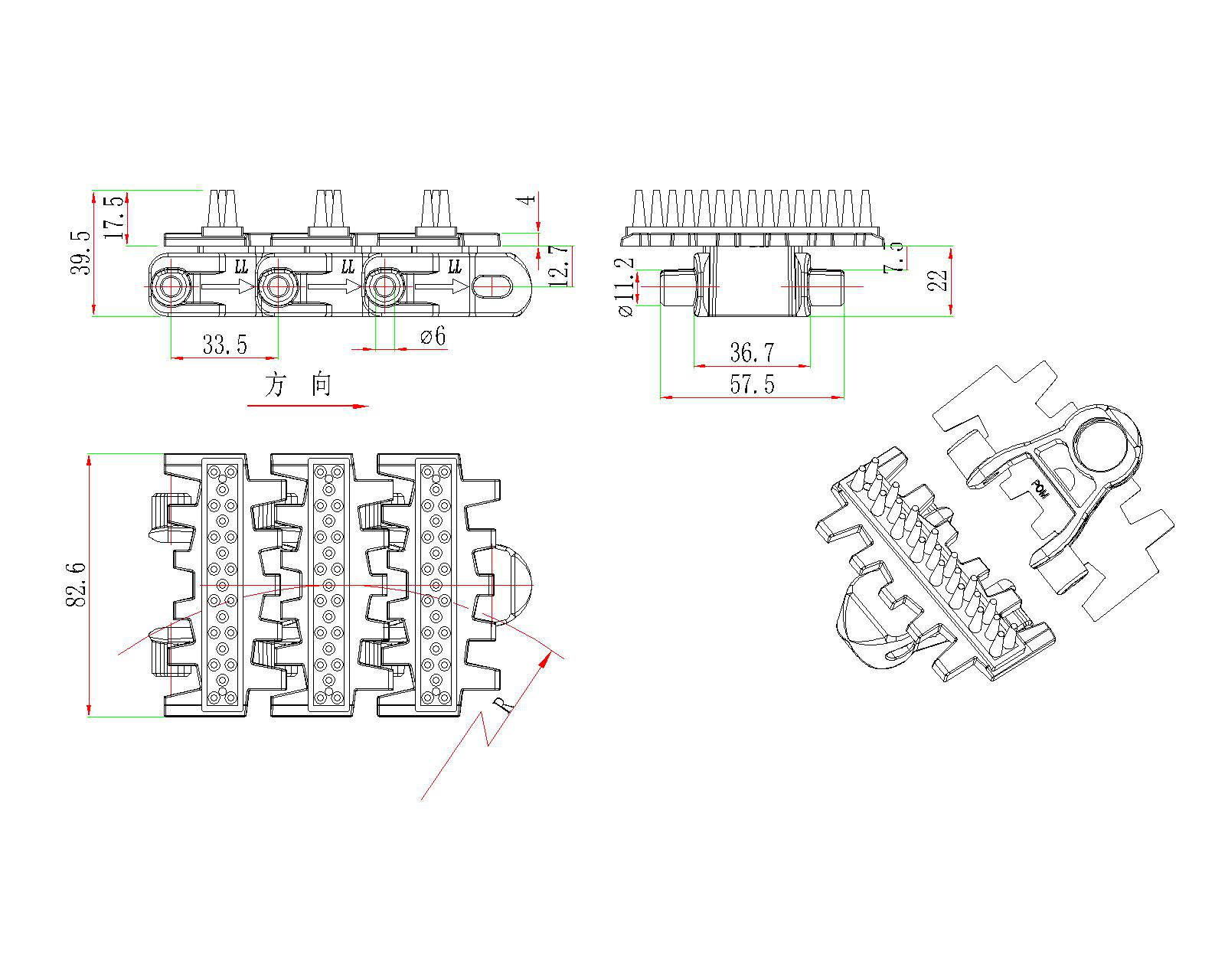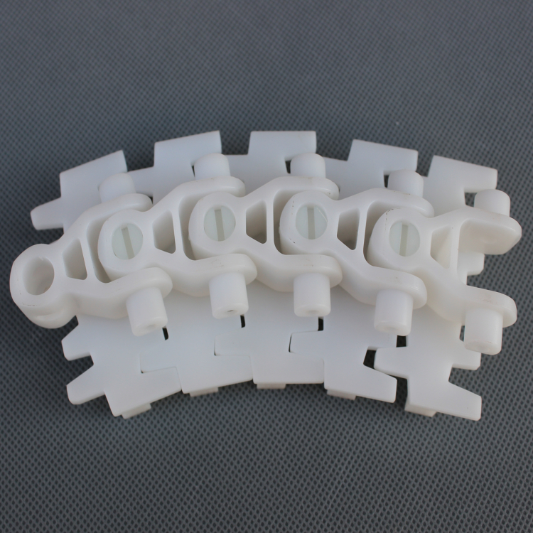 2.材質(zhì):鏈板材質(zhì):聚甲醛(POM),銷軸材質(zhì):冷軋奧氏體不銹鋼。