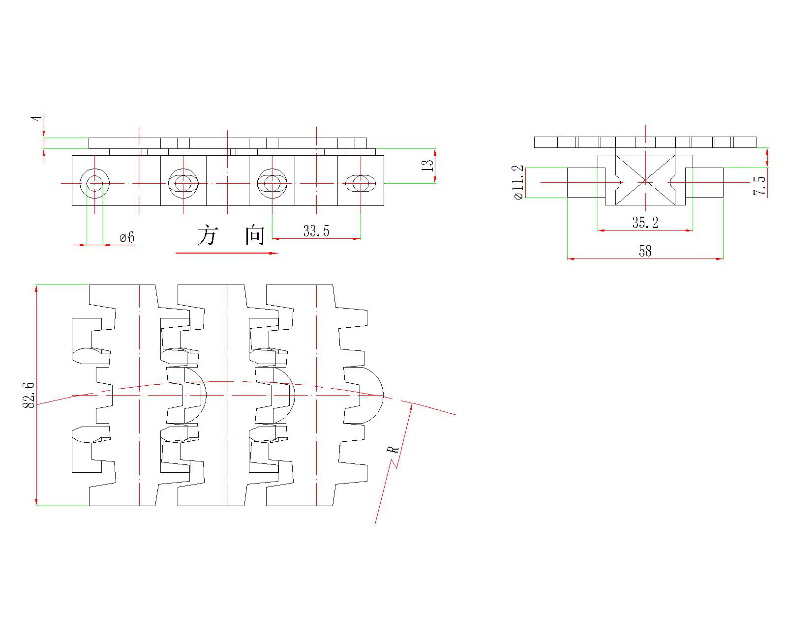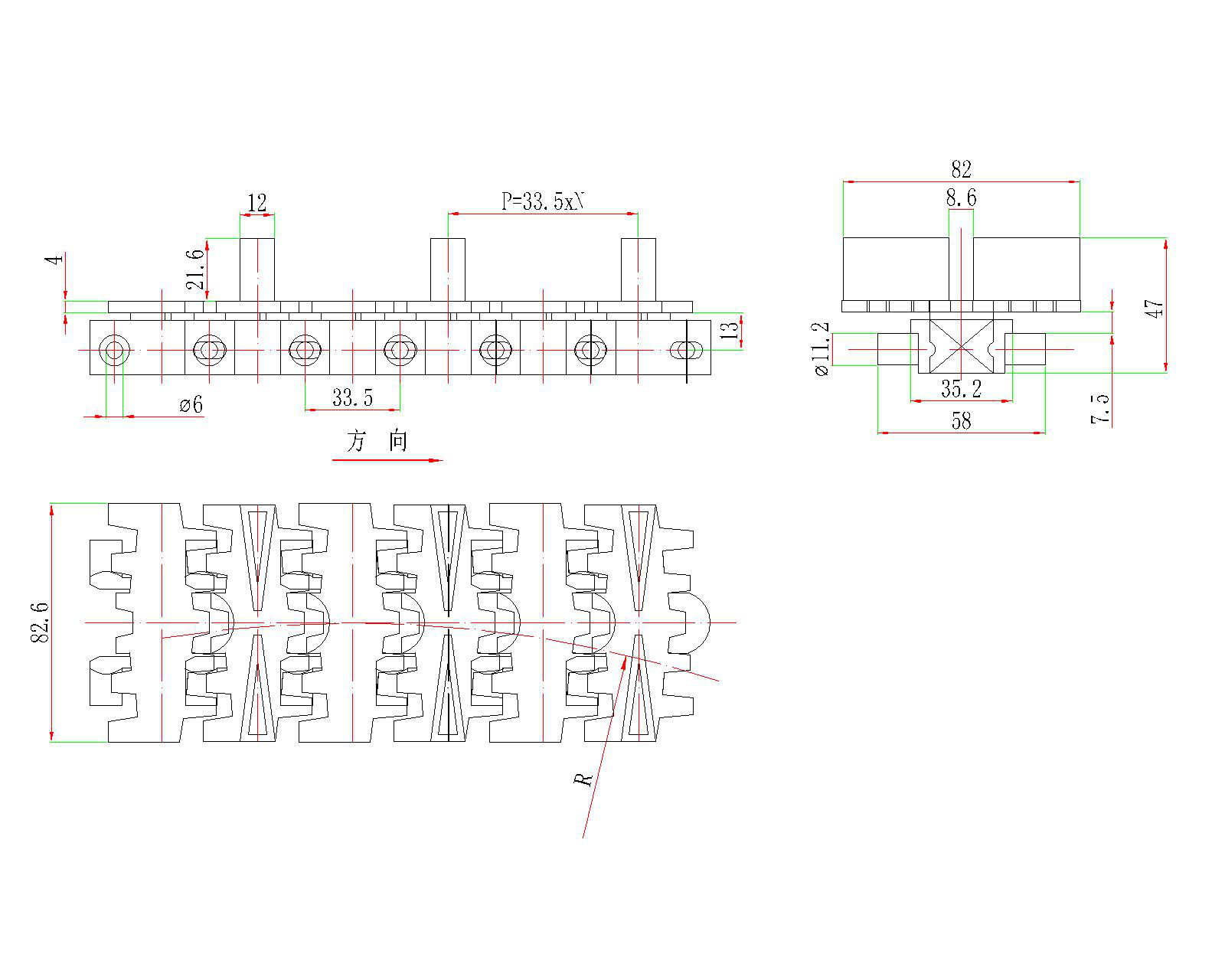 鏈條型號(hào) | 寬度(mm) | 重量(Kg/m) | 反向彎曲半徑 | 轉(zhuǎn)彎半徑 |
