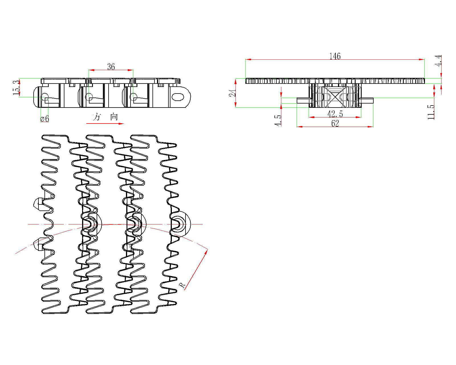 (5)導(dǎo)向裝置:可使物料始終在鏈板中間位置運(yùn)行的兩邊護(hù)欄。
