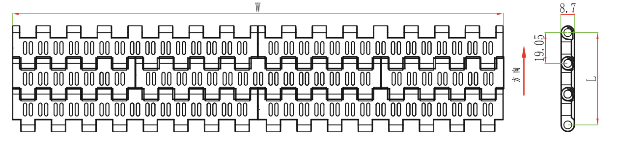 2.材質(zhì):網(wǎng)帶材質(zhì):聚甲醛(POM),銷軸材質(zhì):聚丙烯(PP)